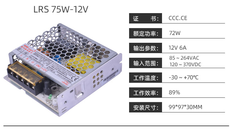 12V開關(guān)電源LRS75W:1.體積小,30mm厚度低外型 2.具有輸出短路、過流、過壓、過溫保護(hù)功能 3.可承受300VAC輸入浪涌電壓5s 4.可承受5G振動測試 5.低待機(jī)功耗(<0.3W)、高效率(高達(dá)91.5%) 6.電源啟動LED指示燈 7.內(nèi)置直流風(fēng)扇強(qiáng)制風(fēng)冷(350W) 8.CE、CCC、CQC認(rèn)證(200W/350W) 9.三年保固