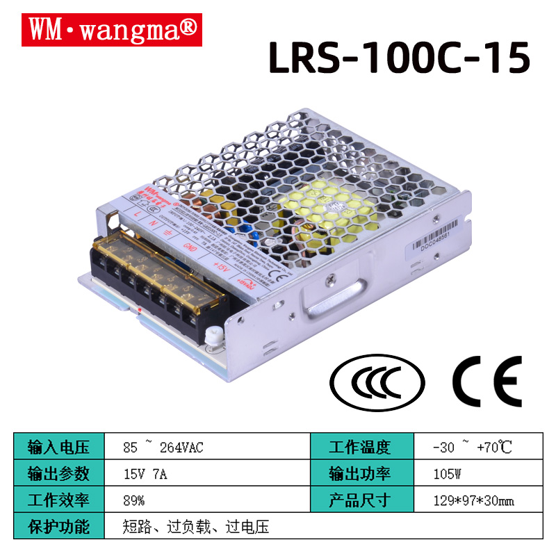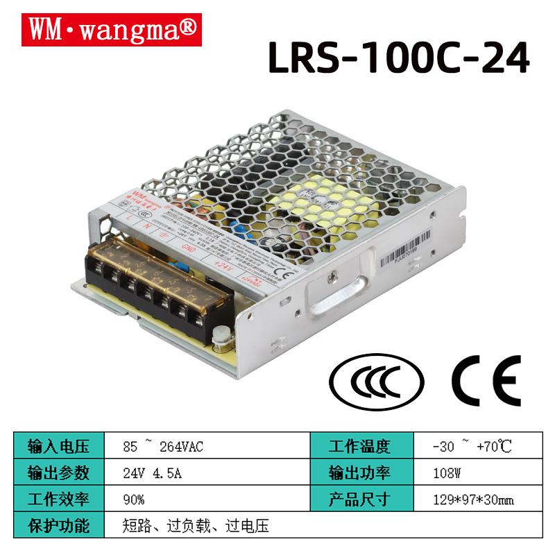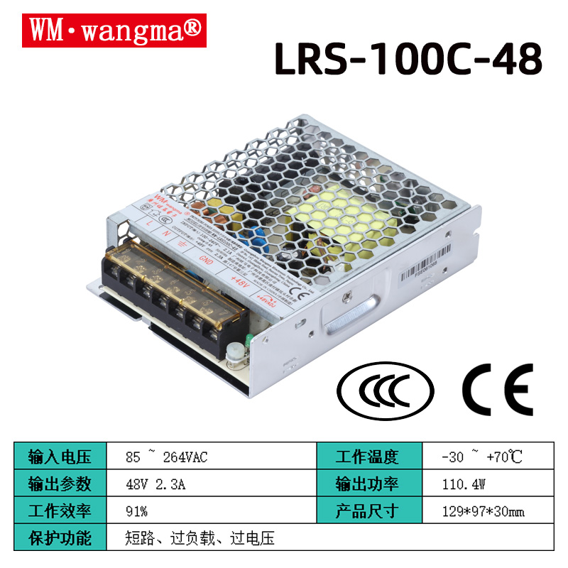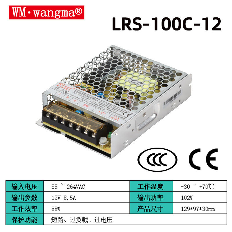 型號后綴:常見輸出電壓有 12V(8.3A,WM-LRS100C-12)、24V(4.2A,WM-LRS100C-24),另有 5V、15V、48V 等定制規(guī)格;