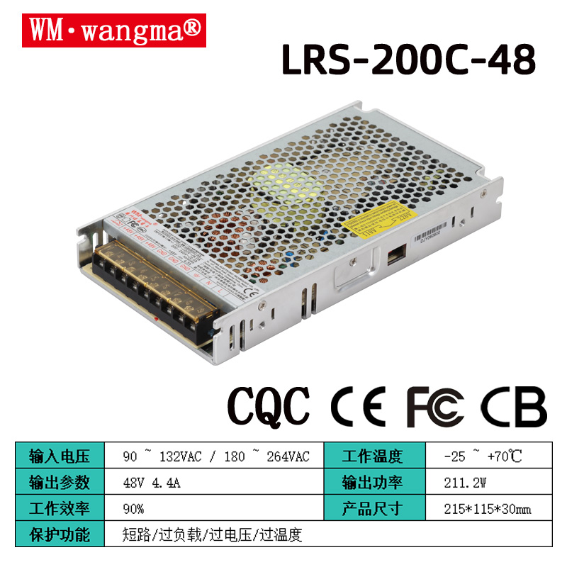 功率與輸出:200W開關(guān)電源單路 DC 輸出;電壓覆蓋 3.3V、5V、12V、15V、24V、36V、48V 等,典型如 LRS-200-24(24V 8.8A)、LRS-200-12(12V 17A)、LRS-200-48(48V 4.4A);輸入可選 115VAC/230VAC(開關(guān)切換),頻率 47–63Hz,可承受 300VAC 浪涌 5 秒。